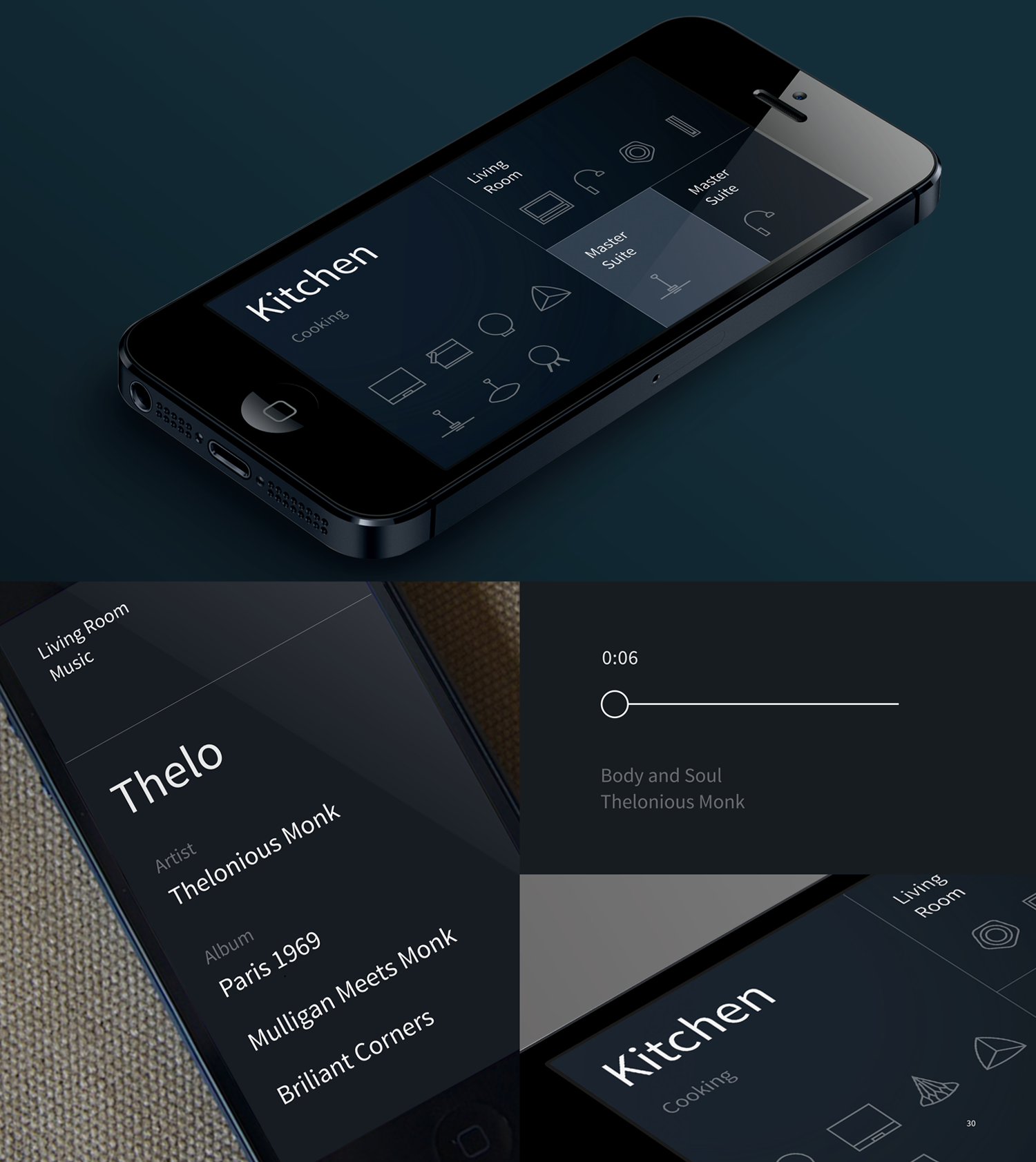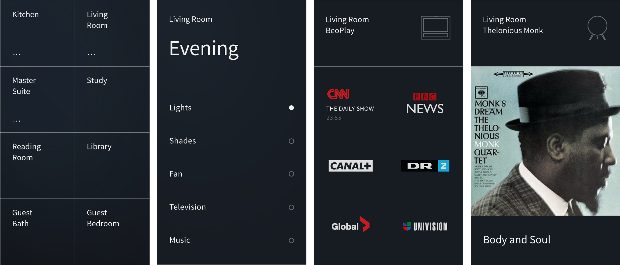 The multi-room app interface gives the you the ability to control not just entertainment devices, but room elements such as lighting, window shades, and fans as well. The more you drill down into the experience, the more information density increases, showing you just what you need for that mode and nothing more or less.
